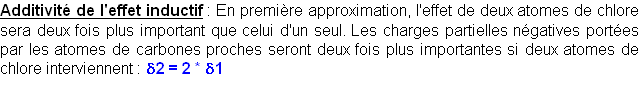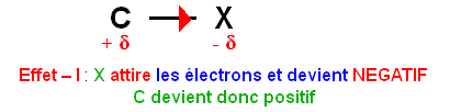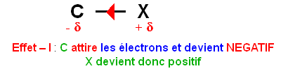 Remarque : nous verrons plus loin que même des groupements d'atomes ne comportant pas d'atome plus électronégatif que le carbone présentent néanmoins cet effet inductif donneur (Effet -I). C'est le cas des substituants alkyles : CH3 , CH2-CH3, CH(CH3)2 etc