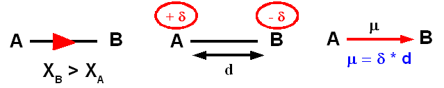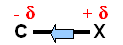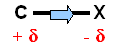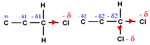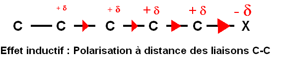 Dans les molécules polyatomiques organiques, la polarisation d'une liaison s comportant par exemple un atome très électronégatif X crée une polarisation induite sur les liaisons Carbone-Carbone environnantes et des charges partielles vont apparaitrent sur des