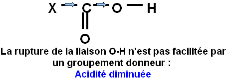 nversement la présence d'un groupement donneur (Effet + I) aura tendance à diminuer l'acidité du composé par augmentation de la densité électronique sur l'oxygène du groupement hydroxyle, la rupture de la liaison O-H, sera moins favorisée et l'acidité diminuera donc.