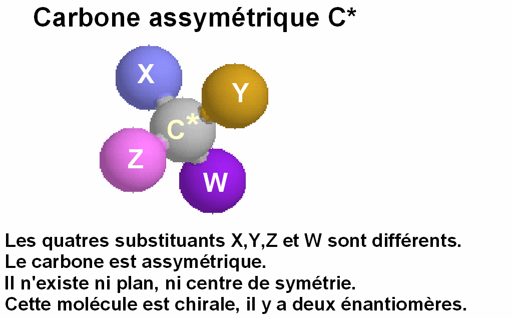 Un atome de carbone hybridé sp3 et portant 4 substituants différents (souvent noté C*) est un centre de chiralité qui induit la possibilité d’existence d’énantiomères.