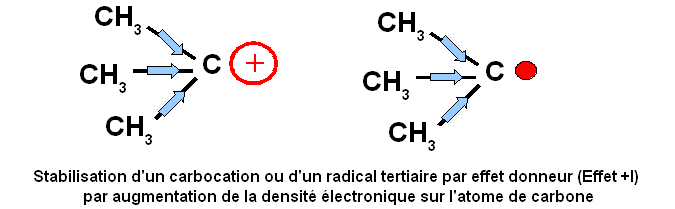 L'effet inductif donneur des groupement alkyles explique également l'ordre des stabilités observées pour les carbocations et les radicaux carbonés.