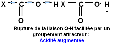 nversement la présence d'un groupement donneur (Effet + I) aura tendance à diminuer l'acidité du composé par augmentation de la densité électronique sur l'oxygène du groupement hydroxyle, la rupture de la liaison O-H, sera moins favorisée et l'acidité diminuera donc.