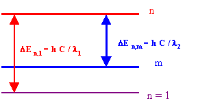 DE n,m = h C / l2 = E0 (1/m2 - 1/n2) = h C RH * (1/m2 - 1/n2)