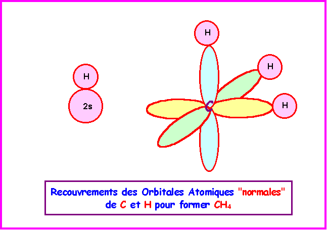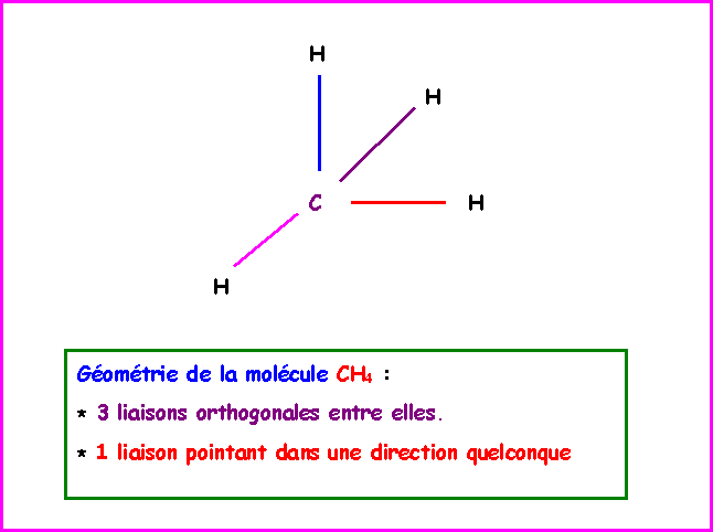 Les deux orbitales utilisées étant toutes deux de symétrie sphérique, la liaison C-H ainsi formée peut être orientée de façon tout a fait quelconque cette liaison n'a donc pas de direction particulière.
