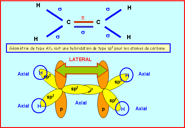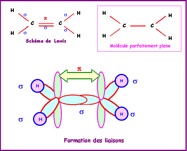 La géométrie autour des deux atomes de Carbone est du type AX3 soit une hybridation trigonale de type sp2. La méthode R.P.E.C.V prévoit une géométrie basée sur deux triangles équilatéraux mais ne dit rien sur la co-planéité ou non de ces deux triangles. Le modèle quantique en revanche prévoit une planéité totale de la molécule. En effet les deux orbitales p ne peuvent se recouvrir latéralement pour donner la liaison p que si elles sont parfaitement parallèles entre elles. Les orbitales sp2 doivent donc toutes être dans le même plan.