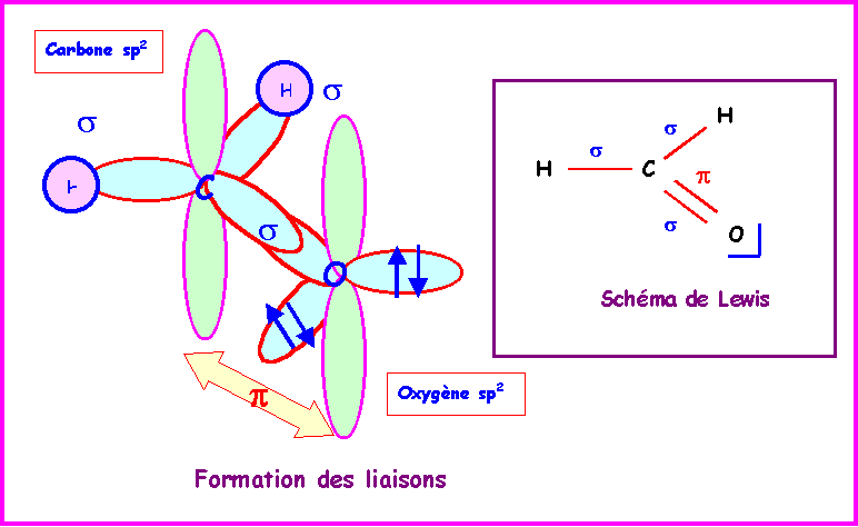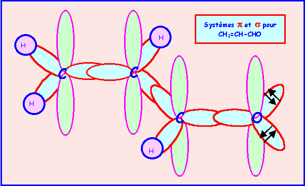 Pour que les liaisons p puissent se former, la molécule adopte une conformation totalement plane. Toutes les orbitales hybrides sp2 se placent dans un même plan et toutes les orbitales p sont alors parallèles, cela permet un recouvrement maximal des orbitales p entre elles ce qui stabilise la molécule. On a affaire à un système dit conjugué, un "nuage" p délocalisé englobe les trois atomes de Carbone et l'atome d'Oxygène.
