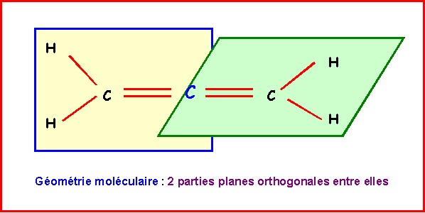 Les deux doubles liaisons sur le même atome de Carbone imposent deux parties planes contenues dans deux plans perpendiculaires entre eux.