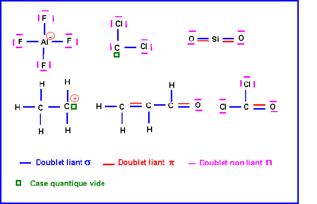 Dans les structures suivantes dénombrer les doublets liants s ou p, les doublets non liants n, et les cases vides présents dans les couches de valence.