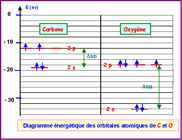 En effet, l'écart Dsp est faible dans le cas du Carbone ( Dsp = 19 -11,7 = 7,3 eV) et important dans le cas de l'Oxygène ( Dsp = 33,7 -17,1 = 16,6 eV).