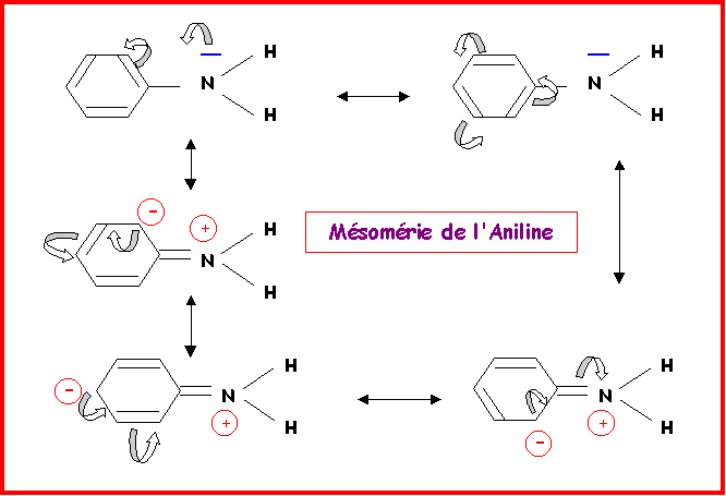 Aniline : Pour ne pas trop surcharger le schéma, le doublet libre de l'atome de carbone porteur de la charge négative n'ont pas été représentés.