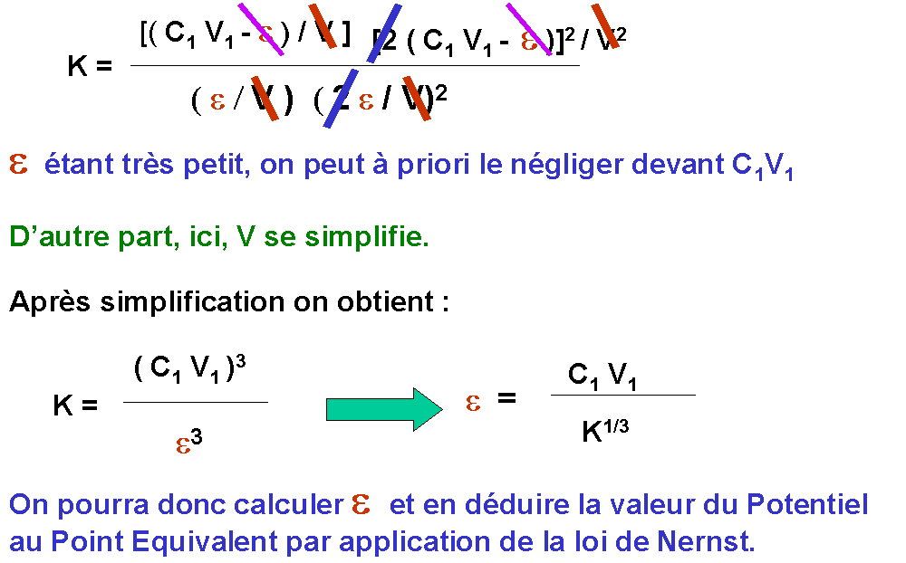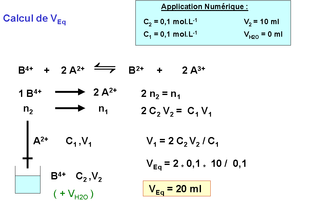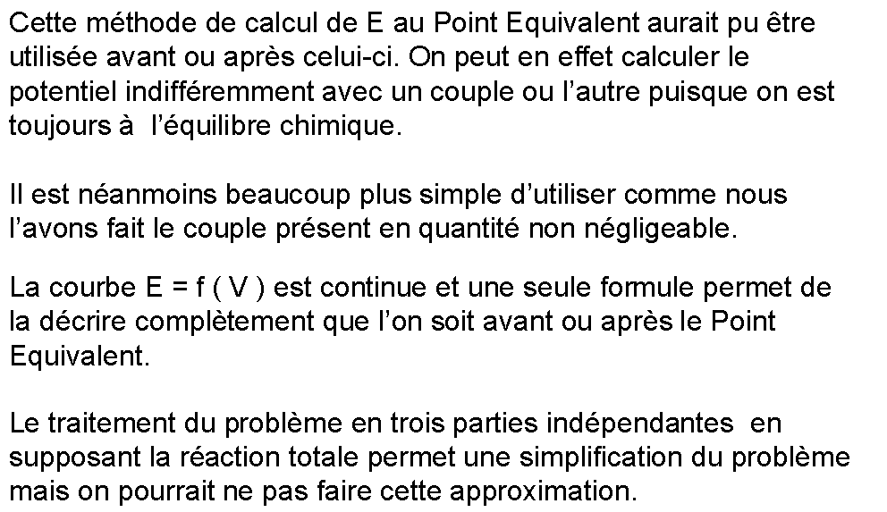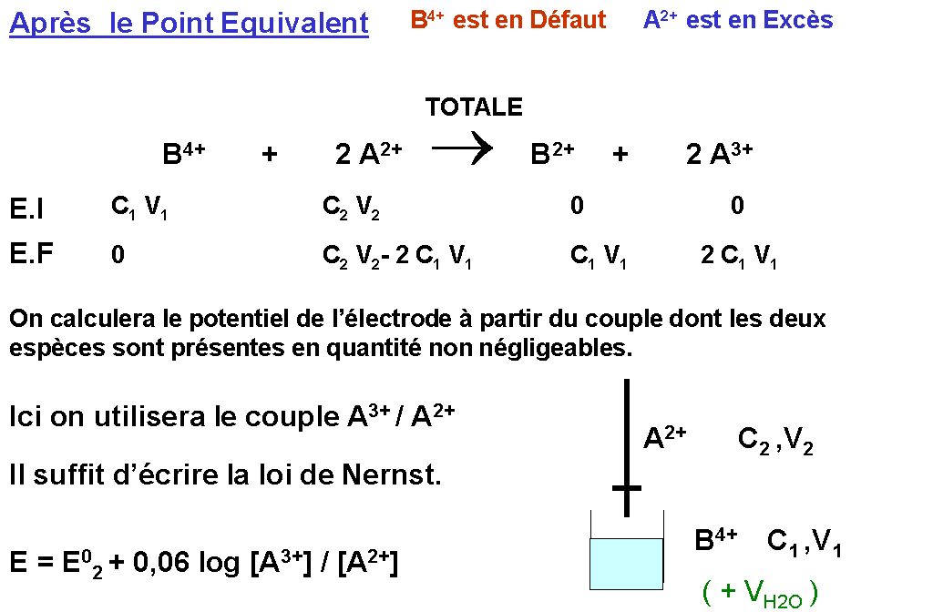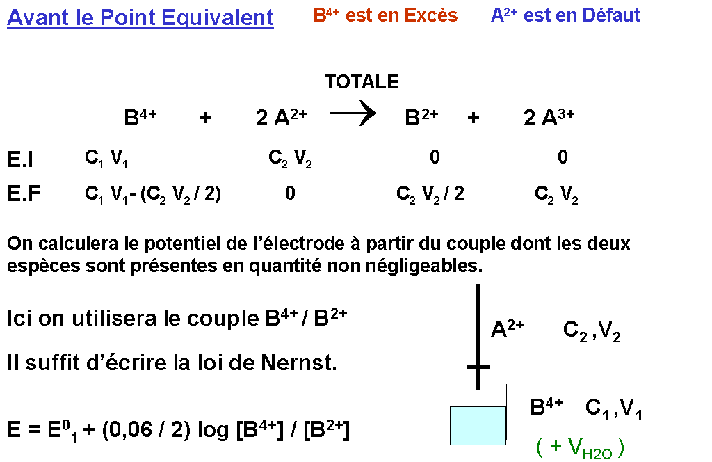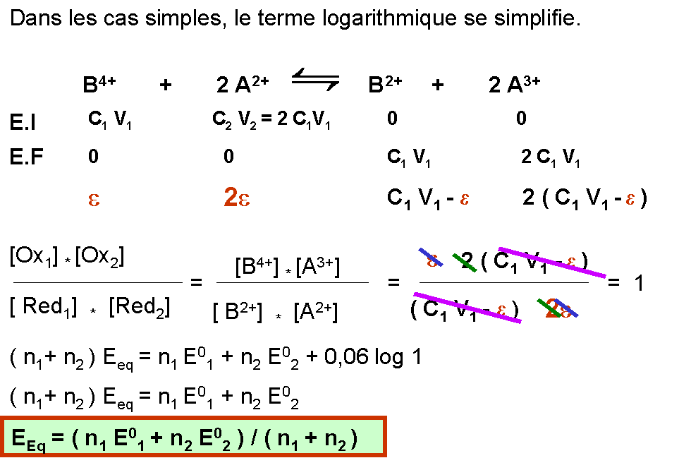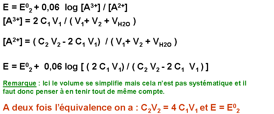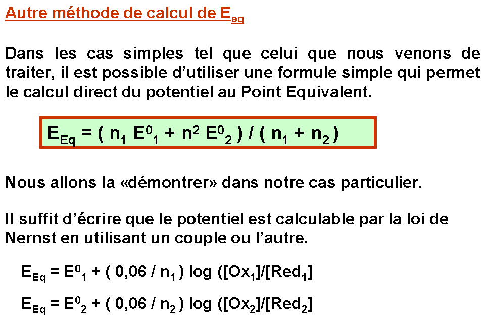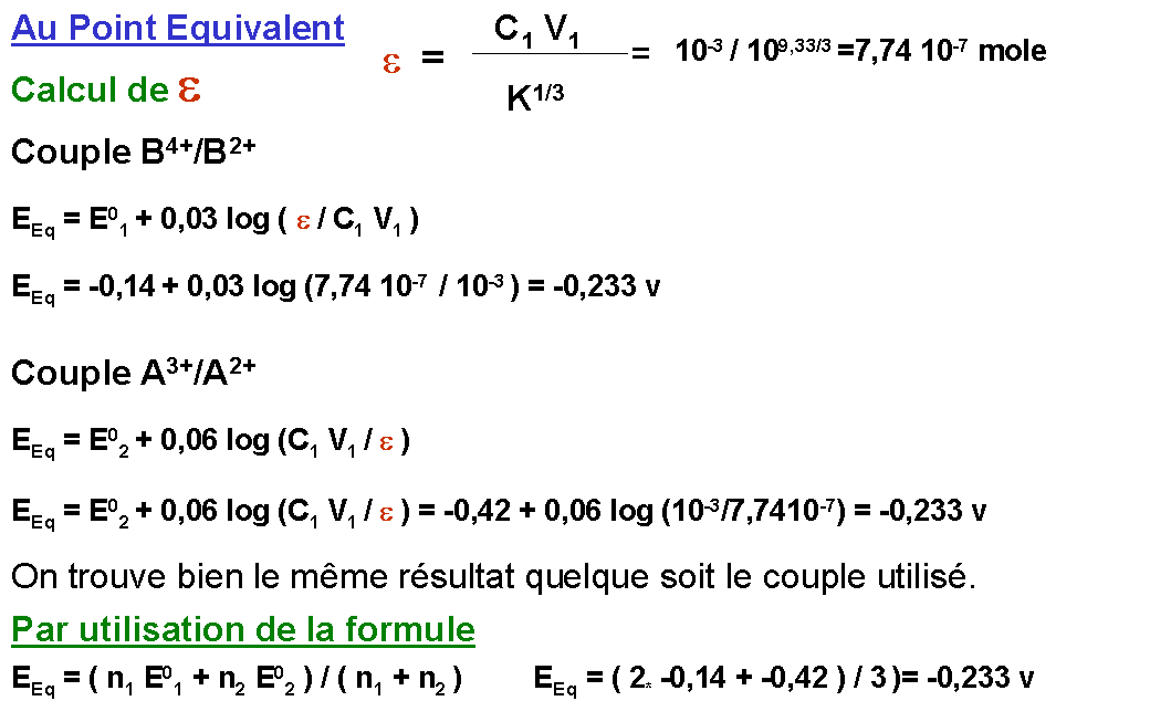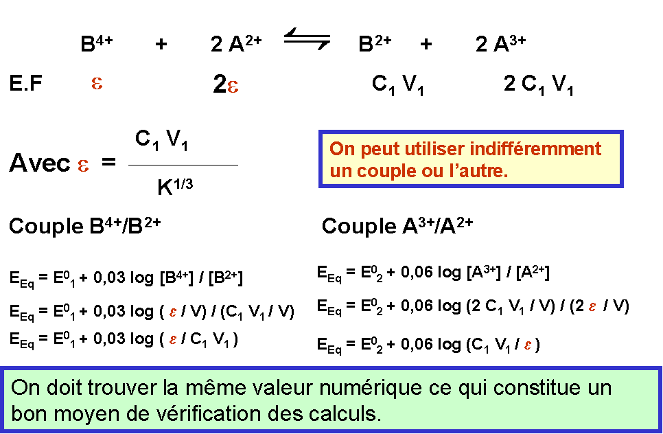 A l'équilibre les deux couples sont simultanément présents, le potentiel de Nernst de la solution est calculable indifféremment soit avec un couple soit avec l'autre.