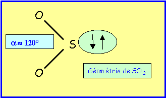 L'angle OSO sera légérement inférieur à 120° à cause des répulsions doublet libre/doublet de liaison (E/X) plus importantes que les répulsions doublet de liaison/doublet de liaison (X/X). Néanmoins, la présence des deux doubles liaisons entraîne également d'assez fortes répulsions, les deux effets étant contradictoires l'angle restera très proche des 120° prévus par la V.S.E.P.R.
