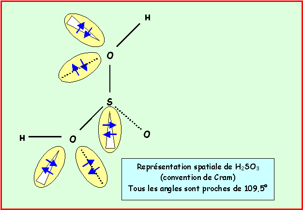 L'angle OSO sera légérement inférieur à 109,5° à cause des répulsions doublet libre/doublet de liaison (E/X) plus importantes que les répulsions doublet de liaison/doublet de liaison (X/X).