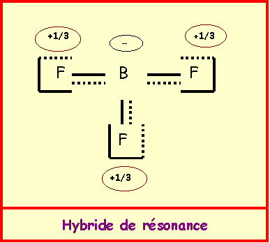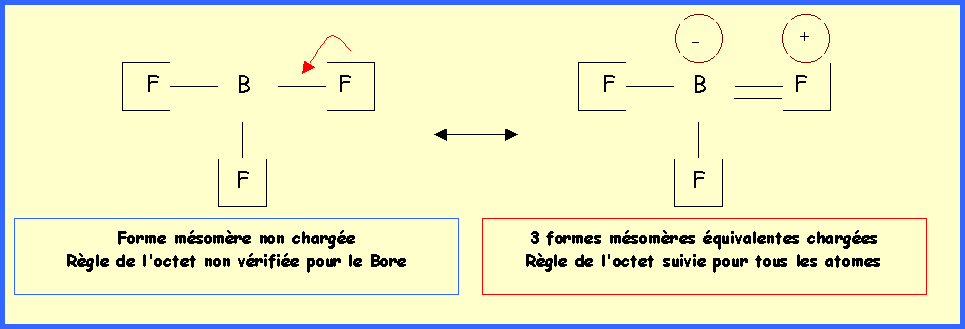Dans cette structure, la liaison B-F est simple, on peut faire apparaître une double liaison en déplaçant un doublet du Fluor. Il apparaît alors des charges formelles.