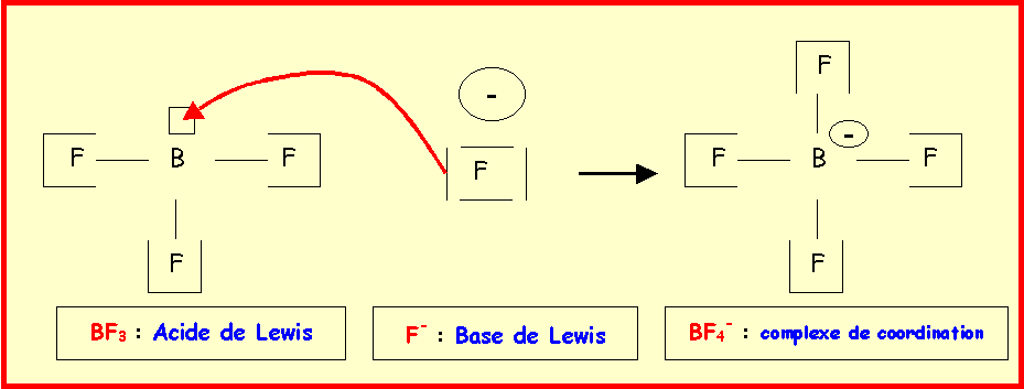 La base de Lewis F- forme une liaison dative (ou liaison de coordination) avec l'acide de Lewis BF3 en utilisant la case vide de B. Il s'agit donc d'une réaction acide base de Lewis.
