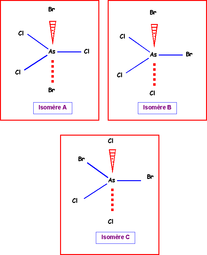 L'existence de ces dissymétries va se répercuter sur les stabilités relatives des trois isomères. L'isomère le plus stable sera celui pour lequel les répulsions entre doublets seront minimales, c'est à dire celui pour qui les doublets seront le plus éloignés de l'atome central. L'atome le moins électronégatif (ici Br) se placera donc préférentiellement en positions équatoriales (angles de 120°) plutôt qu'en positions axiales (angles de 90° uniquement).