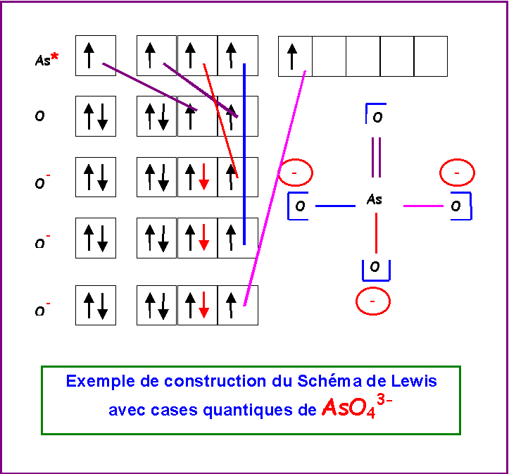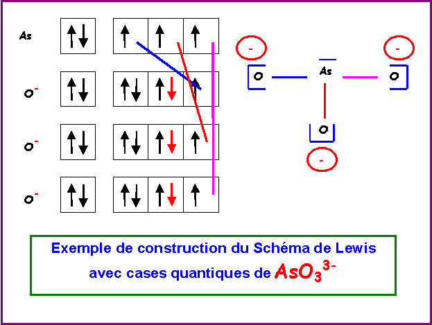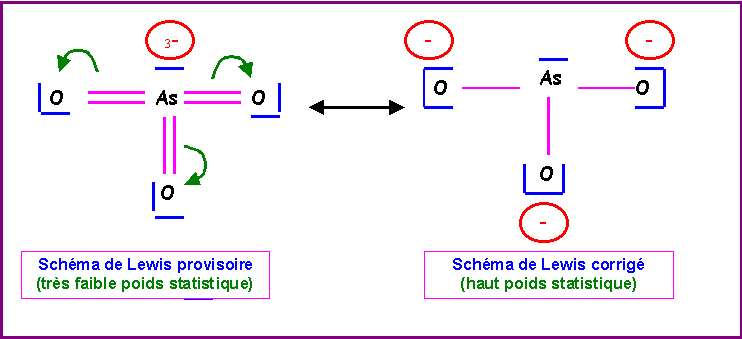 L'Arsenic possède donc 8 électrons et en utilise 6 pour faire les trois doubles liaisons avec les atomes d'Oxygène. Il lui reste donc deux électrons non utilisés soit un doublet libre. Cela permet d'écrire un schéma de Lewis provisoire dans lequel l'atome d'Arsenic porte trois charges négatives. Cet excès de charges sur le même atome doit être corrigé pour obtenir une structure mésomère de plus haut poids statistique, il suffit pour cela de rabattre les doublets des doubles liaisons vers les atomes d'Oxygène. On obtient ainsi le schéma de Lewis corrigé pour lequel ce sont les atomes d'Oxygène qui portent les charges négatives ce qui est en accord avec l'électronégativité de cet atome qui est supérieure à celle de l'Arsenic.