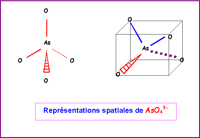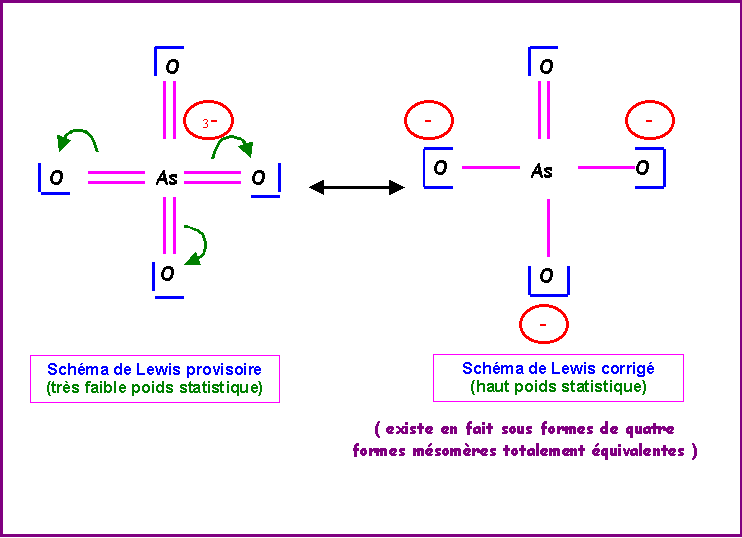 L'Arsenic possède donc 8 électrons et en utilise 8 pour faire les quatre doubles liaisons avec les atomes d'Oxygène. Il ne lui reste donc pas d'électrons non utilisés soit aucun doublet libre. Cela permet d'écrire un schéma de Lewis provisoire dans lequel l'atome d'Arsenic porte trois charges négatives. Cet excès de charges sur le même atome doit être corrigé pour obtenir une structure mésomère de plus haut poids statistique, il suffit pour cela de rabattre les doublets des doubles liaisons vers les atomes d'Oxygène. On obtient ainsi le schéma de Lewis corrigé pour lequel ce sont les atomes d'Oxygène qui portent les charges négatives ce qui est en accord avec l'électronégativité de cet atome qui est supérieure à celle de l'Arsenic. Il existe en fait quatre formes mésomères totalement équivalentes en échangeant simplement les rôles des Oxygènes.