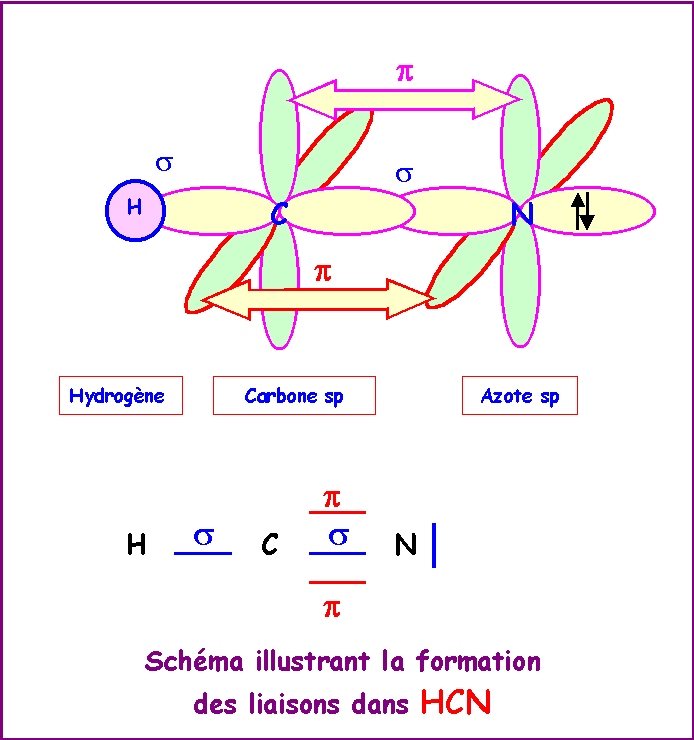 Décrire la géométrie, l'hybridation et la formation des liaisons pour la molécule d'acide cyanhydrique HCN.