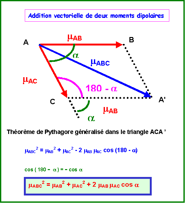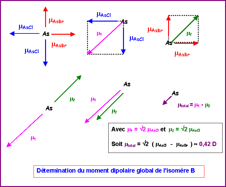 Il suffit ensuite d'additionner les deux résultantes partielles (qui sont de sens opposé) pour obtenir le moment dipolaire global de l'isomère B.