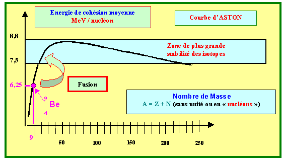Moyen de vérification : On peut vérifier que l'ordre de grandeur obtenu est correct en calculant l'énergie moyenne de cohésion par nucléons ici on trouve 5,4 MeV/nucléon ce qui correspond bien à l'ordre de grandeur de la courbe d'Aston d'environ 8 MeV/nucléon pour les atomes stables 30 < Z < 80.