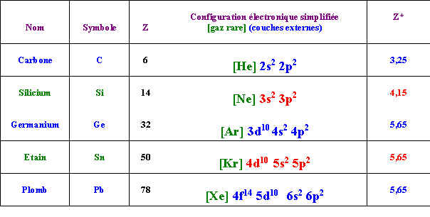 Les éléments de la colonne 14 de la classification périodique sont dans l'ordre de leur numéro atomique croissant : Carbone - Silicium - Germanium - Etain - Plomb