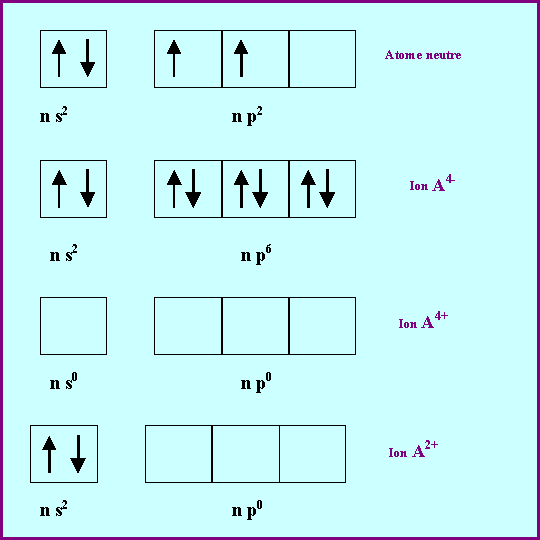 Dans le cas des éléments de la colonne 14, la configuration électronique de la couche de valence est du type : n s2 - n p2. Ils peuvent donc perdre les 4 électrons de leurs couche de valence pour donner l'ion A4+. Ils peuvent également ne perdre que les deux électrons p pour donner l'ion A2+, cet ion est également stable en raison de la sous-couche n s2 totalement remplie.