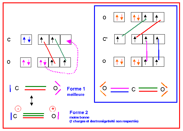 2) Nous avons vu que le carbone pouvait avoir les valences 2 ou 4. L'oxygène ne possède lui que la valence On pourra donc obtenir CO (monoxyde de carbone) ou CO2 (dioxyde de carbone). Les schémas de Lewis moléculaires se déduisent facilement de ceux des atomes.