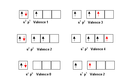 La prévision a priori des formules se fait dans les cas les plus simples en se basant sur la notion de valence des éléments. La valence correspond le plus souvent au nombre d'électron célibataire présent sur la couche de valence de l'élément étudié. Dans le modèle de Lewis se sont ces électrons célibataires qui formeront le plus souvent les liaisons chimiques en s'associant avec un autre électron célibataire d'un autre atome. Le doublet ainsi constitué formant la liaison chimique. Il faut toutefois tenir compte de la possibilité d'excitation des atomes, qui peut modifier la valence de ceux-ci. Ainsi les configurations électroniques de type s2 p1 a un seul électron célibataire pourront facilement se transformer en s1 p2 a trois électrons célibataires. La valence passant alors de 1 à 3. De même les configurations en s2 p2 de valence 2 conduiront facilement à la valence 4 par excitation en s1 p3. Enfin les configuration en s2 de valence 0 pourront par excitation en s1 p1 conduire à la valence 2. Il existe encore d'autres types d'excitations qui seront envisagées plus loin.