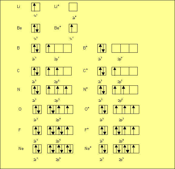 Li : 5,4 eV -Be : 9,3 eV - B : 8,3 eV -C : 11,3 eV - N : 14,5 eV -O : 13,6 eV -F : 17,4 eV - Ne : 21,6 eV
